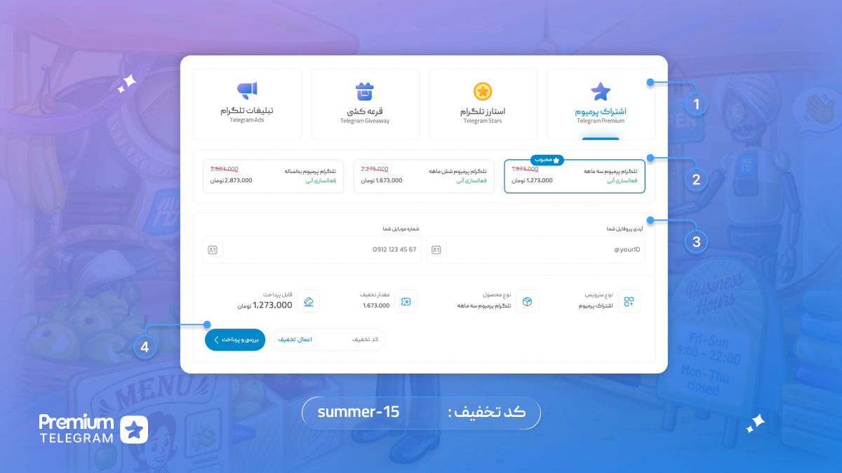 ۱. از داخل تنظیمات اپلیکیشن تلگرام ۲. استفاده از ربات رسمی @PremiumBot برای خرید مستقیم ۳. خرید از اپاستور یا گوگلپلی